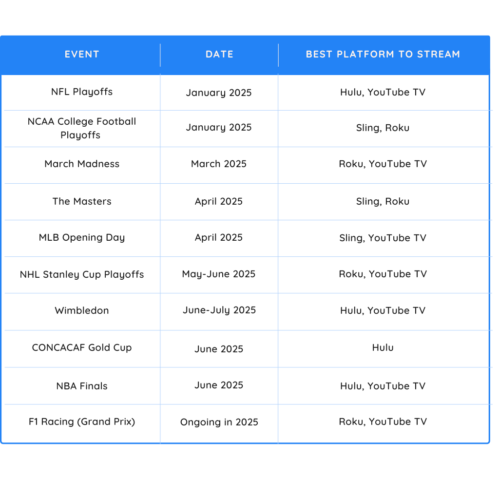 Now, let’s talk about what’s coming up in 2025. The live sports streaming schedule is packed with major events that fans won’t want to miss. Whether you’re targeting NFL fans, NCAA enthusiasts, or global sports followers, there’s something for every audience.